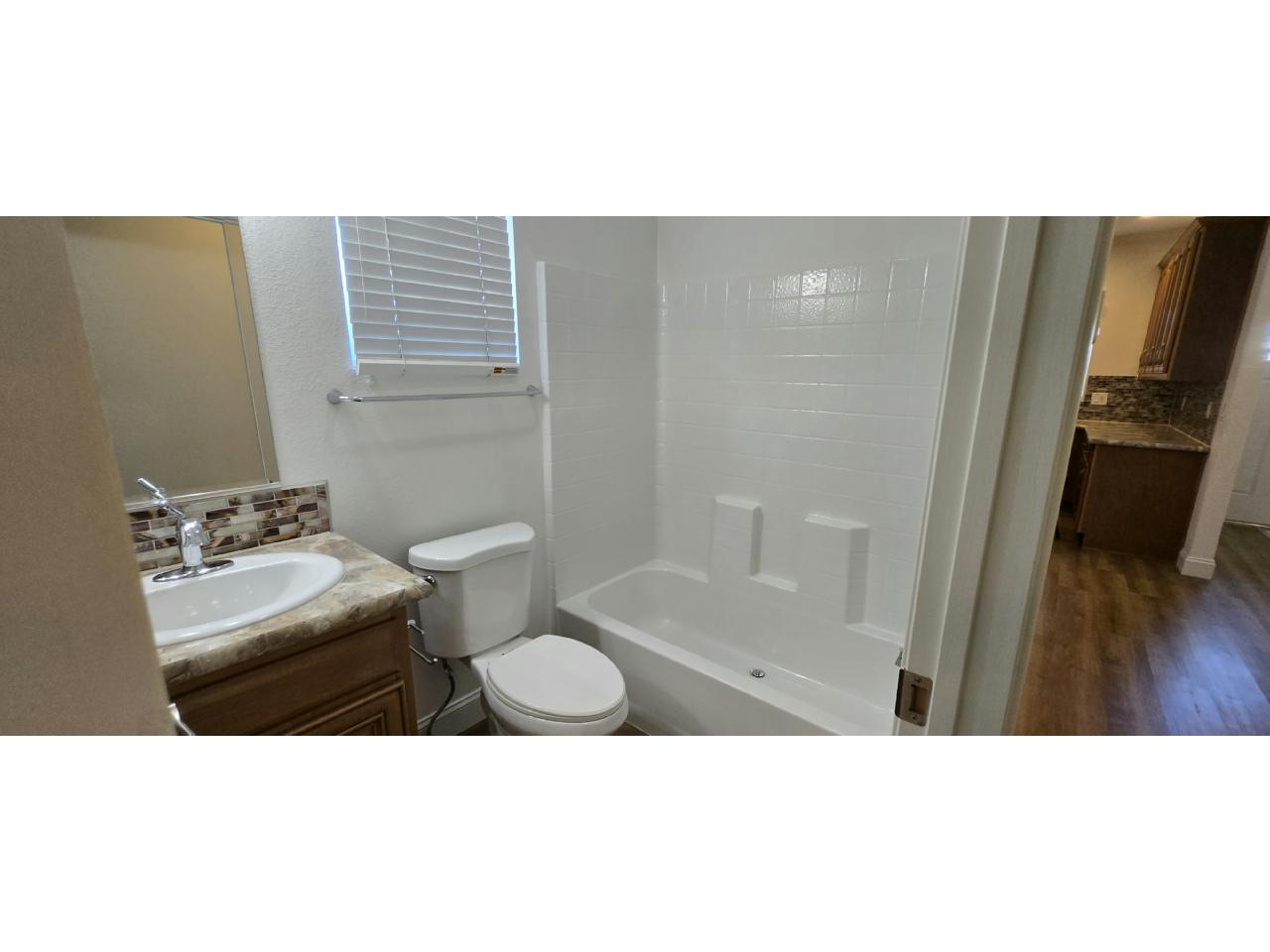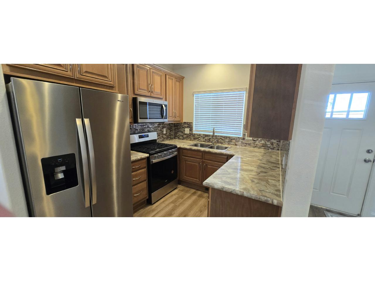 This home is just like new!!. kitchen in U form feature stainless steel appliances, upgraded fridge with dual doors and ice maker, formica countertops with ceramic back splash. Master bedroom shows a useful walking closet and shower enclosure on bath. Vinyl flooring over living and kitchen areas, carpet in bedrooms. Wall to wall closets in 2nd and 3rd bedrooms. 2 car driveway, custom wood storage shed. Community for all ages with 2 pools, playground and clubhouse. Located close to freeways, shopping, schools and transportation.
