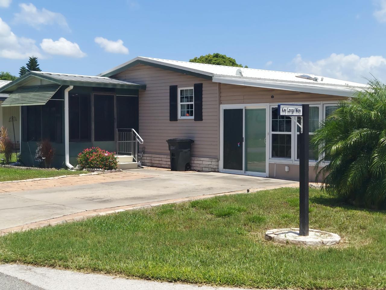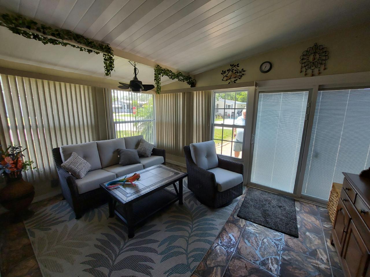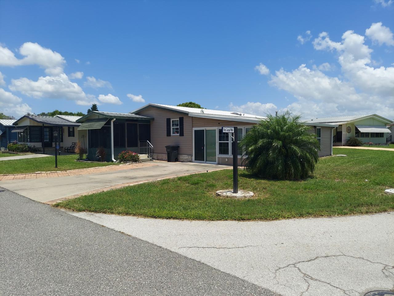 This beautiful home is loaded with upgrades. Both bathrooms have been remodeled, A/C 2 years old, new lighting fixtures throughout home, all new appliances including front loading washer & dryer. Additionally there is a Florida Room and a 4 Season Lanai with new sliding glass door and window treatments. This home comes with a newly built Golf Cart Garage all on an oversized lot! Most of the furniture conveys with the home.