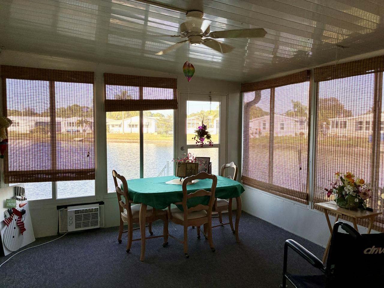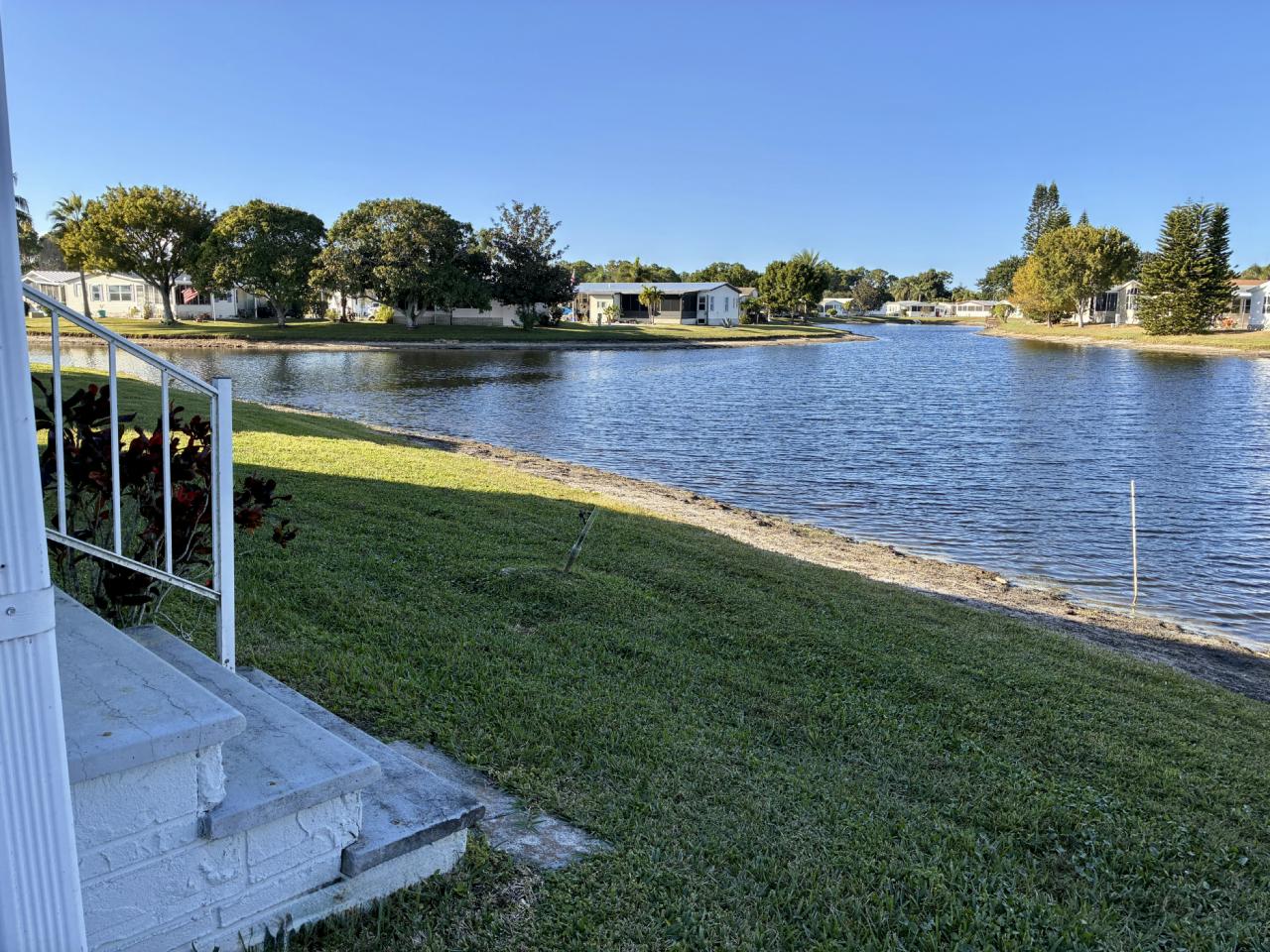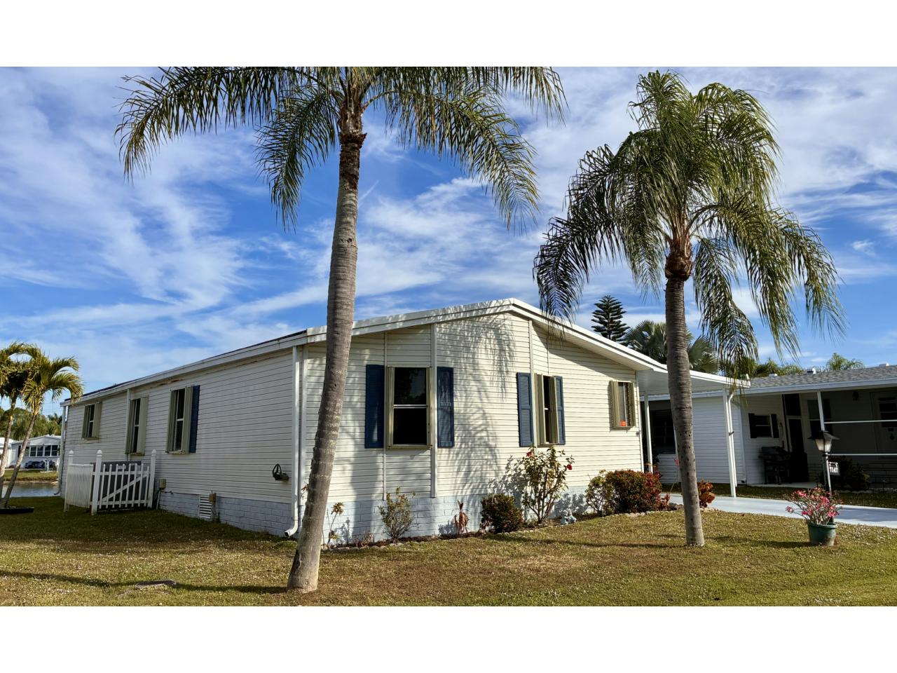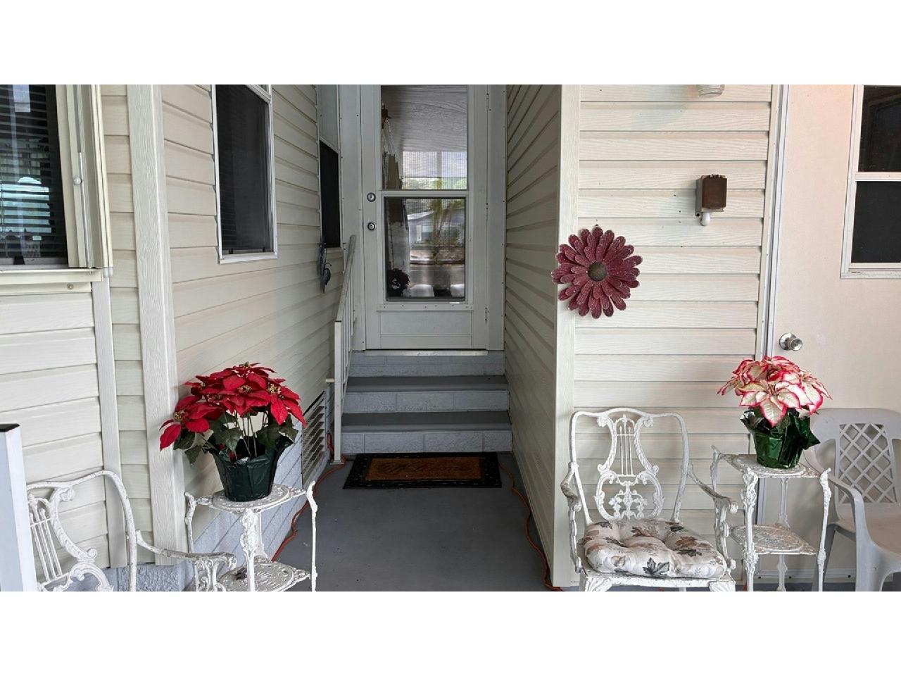 This is the former park model home, and is one of the largest homes in the community! Enjoy wonderful lake / fountain views from the spacious living room and private 4-season Florida room. Home boasts eat-in kitchen with new wall oven, large formal dining room, fireplace negotiable, large owner suite. Accordion storm shutters 2022, hot water heater 2025, carpet 2022, A/C 2018 (compressor 2025).Separate laundry room with newer washer & dryer included. Pride of ownership abounds – don’t miss this rare opportunity to own a gem!